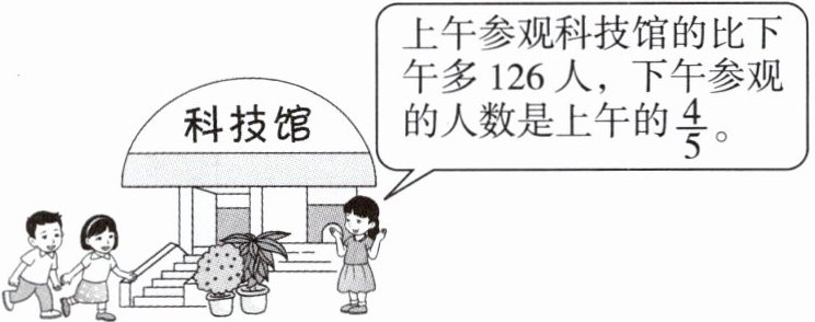 解:设上午有x人。$x-\frac {4}{5}x=126$ $x=630$ 下午参观的人数:$\frac {4}{5}x=\frac {4}{5}×630=504$ 答:上午有630人参观科技馆,下午有504人参观科技馆。