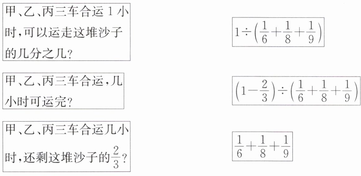 一堆沙子,甲车单独运完要6小时,乙车单独运完要8小时,丙车单独运完要9小时。