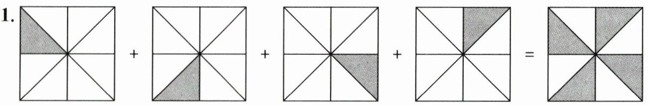 答案: $\frac{1}{8}+\frac{1}{8}+\frac{1}{8}+\frac{1}{8}=\frac{1}{2}$ $\frac{1}{8}× 4=\frac{1}{2}$