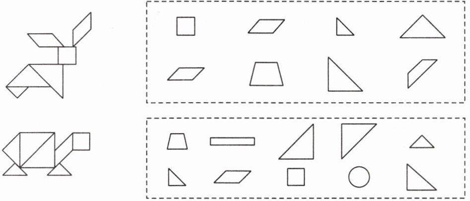 2. 图中的七巧板缺少了( )块,分别是( )形和( )形,请你把它补充完整。