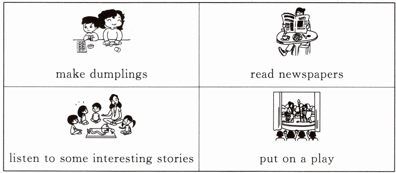 In the morning, my mom and I are going to make dumplings for our family. My father is going to read newspapers. In the afternoon, we are going to listen to some interesting stories. Tomorrow evening, we are going to put on a play.