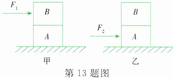 13. 如图甲所示,完全相同的 A、B 两个物块叠放在水平桌面上,用$F_{1}= 10N$的水平力作用在 B 物块上,A、B 一起做匀速直线运动,此时 B 物块所受的摩擦力为