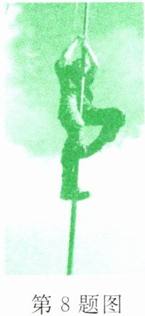 8. 在学校运动会爬杆比赛中,小明第一个爬到杆顶。如图所示,小明紧紧握住杆子保持静止,此时他受到的摩擦力为$f_{1}$;片刻后,小明适度减小握杆子的力量使自己匀速滑下,此时他受到的摩擦力为$f_{2}$,则 (