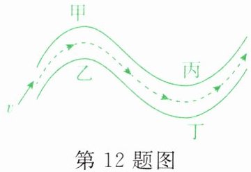 12. 小宇在家观看汽车拉力赛的电视节目,发现汽车行驶速度很快。其中途经一段“S”形弯道时,如图所示。他想:现场观看的观众为了更安全,应站的位置是图中的