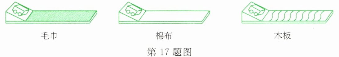 17. 小明先后在水平桌面铺上粗糙程度不同的物体(毛巾、棉布、木板),做了三次实验,然后将实验数据填入下表。请回答以下问题:
