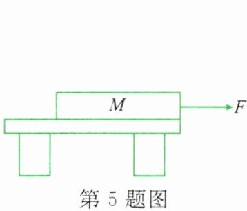 5. 如图所示,水平桌面上有一长为L,质量分布均匀的木板M,其右端与桌边相齐,在水平拉力F的作用下,沿直线向右匀速离开桌边$\frac {1}{4}L$。在此过程中,下列说法正确的是(