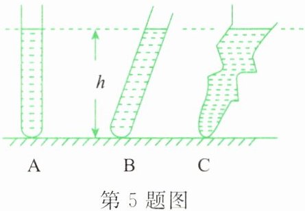 5. 如图所示,A、B、C三个容器中分别装有盐水、清水和酒精,三个容器中液面相平,容器底部受到液体的压强分别为$p_{A}$、$p_{B}$、$p_{C}$,则(