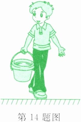 14. 如图所示,小明同学提了11kg的水给树苗浇水,已知桶的自身重量为1kg,桶的底面积为$5×10^{-2}m^{2}$(桶的厚度不计),桶中水深20cm,提水时手的受力面积为$0.8×10^{-3}m^{2}$。($\rho_{水}= 1.0×10^{3}kg/m^{3}$,g取10N/kg)求: