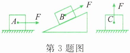 3. 如图所示,A、B、C三个物体的质量关系是$m_{A}>m_{B}>m_{C}$,它们在同样大的力F作用下,沿力的方向移动了相同的距离s,则力F对三个物体所做的功(