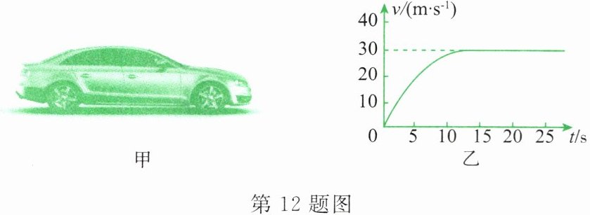 12. 随着生活水平不断提高,小龙家最近也买了辆轿车。若轿车以90 kW的恒定功率启动做直线运动,运动过程中受到的阻力不变,运动的速度v与时间t的关系如图乙所示,则经过10 s轿车发动机所做的功为
