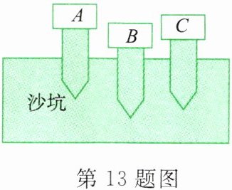 13. 在做“探究物体的重力势能与哪些因素有关”的实验时,三个完全相同的木桩被从正上方由静止释放的铁块撞击后,陷入沙坑中的情况如图所示。