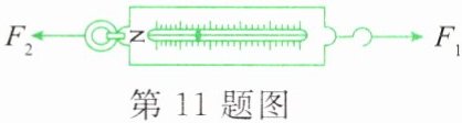 11. 如图所示,用大小均为3N,方向相反的水平拉力$F_{1}$、$F_{2}$拉弹簧测力计的两端,弹簧测力计保持静止,则此时弹簧测力计的示数为