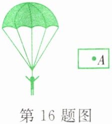16. 如图所示,跳伞运动员在空中刚打开降落伞的一段时间内,随降落伞一起竖直减速下落,请以A点为力的作用点,画出此时跳伞运动员受到的拉力和重力的示意图。