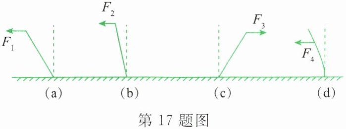 17. 如图所示,使一薄钢尺的下端固定。现分别用不同的力去推它,使其发生(a)(b)(c)(d)各图中所示的形变,如果$F_{1}= F_{3}= F_{4}>F_{2}$,那么: