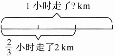 5. 红红在解决“已知小明$\frac{2}{3}$小时走了 2 千米,求小明每小时走多少千米?”这个问题时,她是用画线段图的方法来帮助思考(如图),并列式计算:$2÷\frac{2}{3}= 2×\frac{1}{2}×3= 3$(千米)。根据线段图,“$2×\frac{1}{2}$”这一步表示的是小明( )小时走了( )千米。