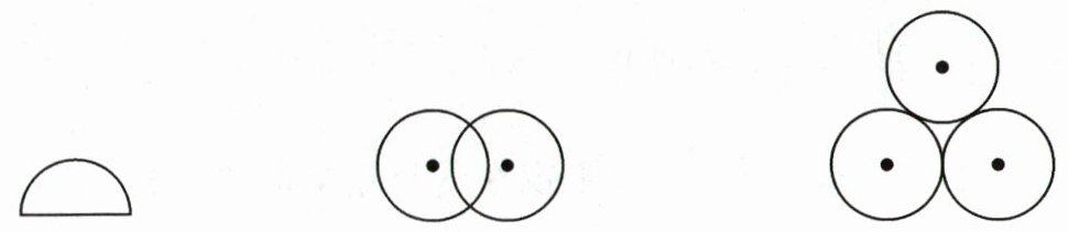 (由于无法直接绘制图形,此处应在原图基础上画出对称轴:第一个图形(半圆)画1条垂直于直径的对称轴;第二个图形(两个相交等圆)画1条过两圆圆心的对称轴;第三个图形(三个相切等圆呈三角形分布)画3条过每个圆的圆心与另外两个圆圆心连线中点的对称轴。)