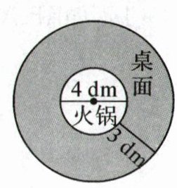 3. 王阿姨家火锅店开张啦!店内特制的火锅直径是4 dm,圆环桌面的宽度是3 dm(如图),这个圆环桌面的面积是多少平方分米?(5分)