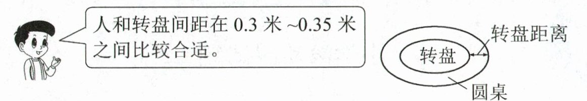 (2)0.3米=30厘米 0.35米=35厘米 $180-30×2=120$(厘米) $180-35×2=110$(厘米) $260+380=640$(元) 答:买直径是120厘米的转盘合适,这样一套餐桌和转盘共要640元。
