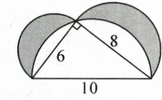 周长:$(3.14×6+3.14×8+3.14×10)÷2=37.68(cm)$ 面积:$3.14×(6÷2)^{2}÷2+3.14×(8÷2)^{2}÷2+6×8÷2-3.14×(10÷2)^{2}÷2=24(cm^{2})$