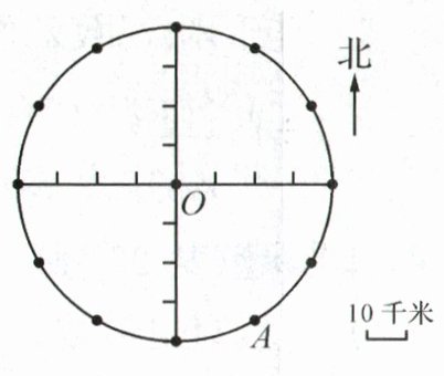 (2)B点在O点西偏南30°方向,距O点20千米位置,请标出B点的位置。(2分)