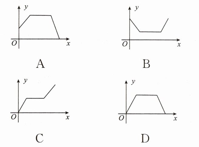 2. 某洗衣机在洗涤衣服时经历了注水、清洗、排水三个连续过程(工作前洗衣机内无水),在这三个过程中洗衣机内水量$y$(升)与时间$x$(分)之间的函数关系对应的图像大致为(