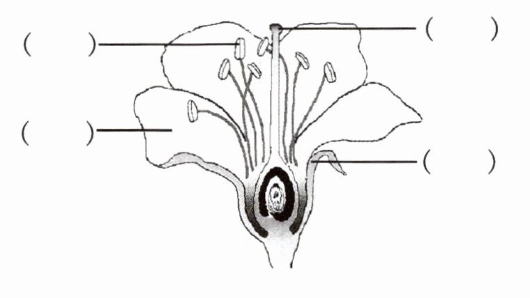 把花的雄蕊、雌蕊、花瓣、花萼四部分分别填写在下图的括号中。