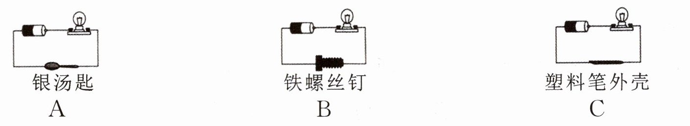 1. 如图所示,用导线把灯泡、电池分别和三种物品相连,灯泡一定不发光的是(