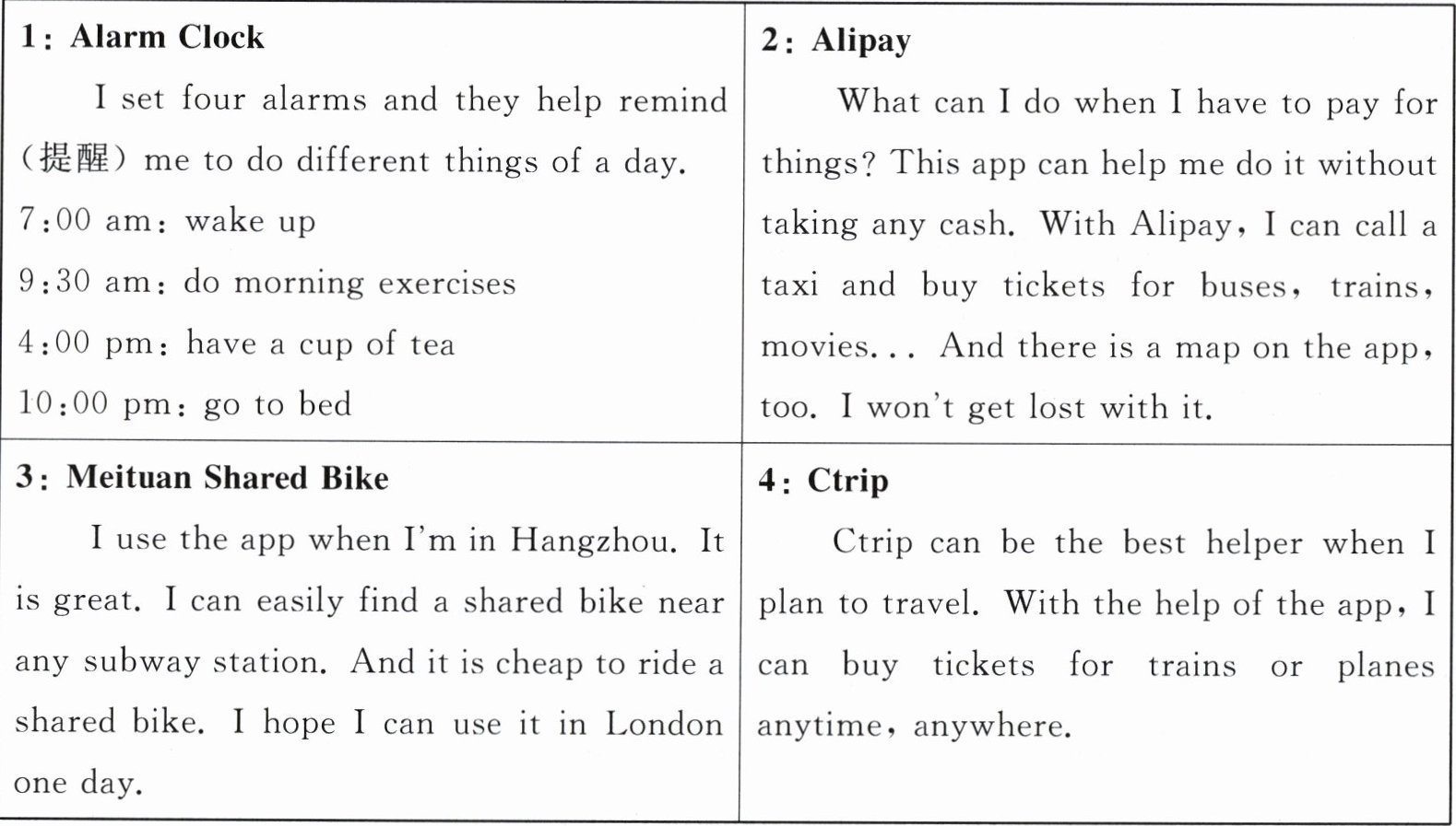 )3. Which apps can David use to buy train tickets?A. 1 and 2.