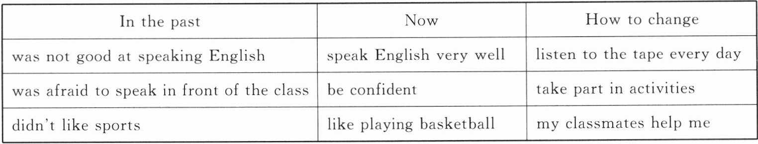 In the past, I was not good at speaking English. But now I speak English very well, because I listen to the tape every day. Then, the most important change I have ever made is that I am more confident. When I was a child, I was afraid to speak in front of the class. But now I become confident by taking part in activities. What’s more, I didn’t like sports before, but now I like playing basketball. It is because my classmates help me a lot.