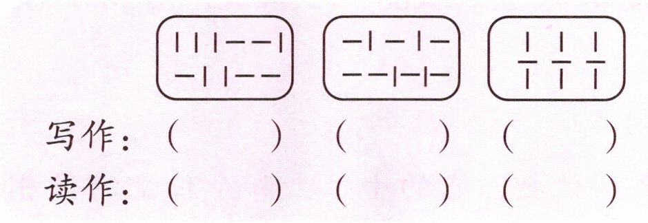 2. 甲骨文是迄今为止中国发现的年代最早的成熟文字系统。假如在甲骨文中-表示1,|表示10。下面的图各表示多少?写一写,读一读。