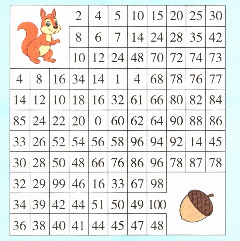 从2开始跳,每次跳的下一个数都是在前一次跳的数的基础上加2,依次跳下去,最后跳到100。请用笔把这些数字连起来,帮小松鼠走出迷宫找到果实吧。