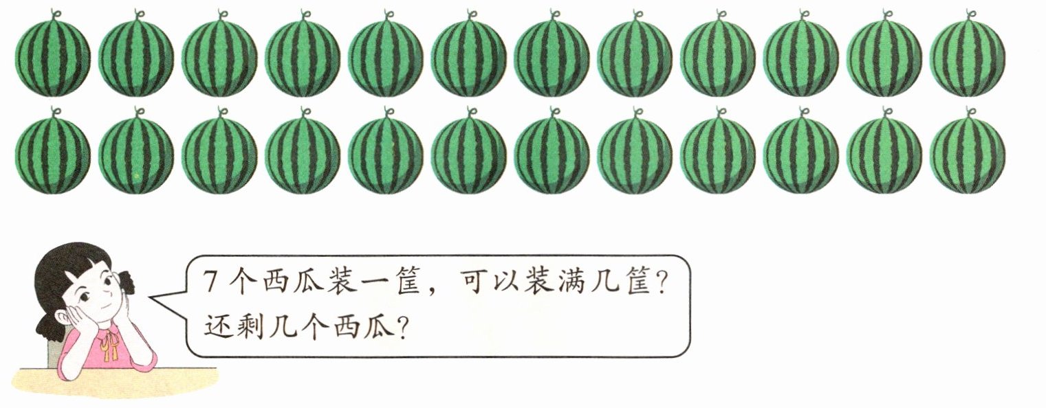 解答此类问题,有两种方法。方法一:圈一圈,可以7个7个地圈,有几个圈就能装满几筐,没有圈住的西瓜个数就是剩下的西瓜个数;方法二:可以用减法计算,
