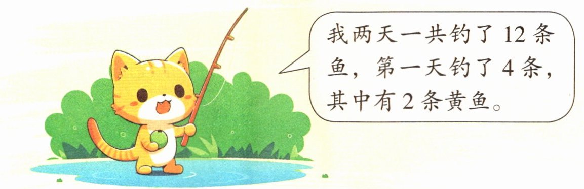 【解析】:求小猫第二天钓的鱼的数量,已知两天一共钓了12条鱼,第一天钓了4条,“其中有2条黄鱼”为多余条件。用两天总共钓的鱼数减去第一天钓的鱼数,即可得到第二天钓的鱼数,列式为12 - 4 = 8(条)。
