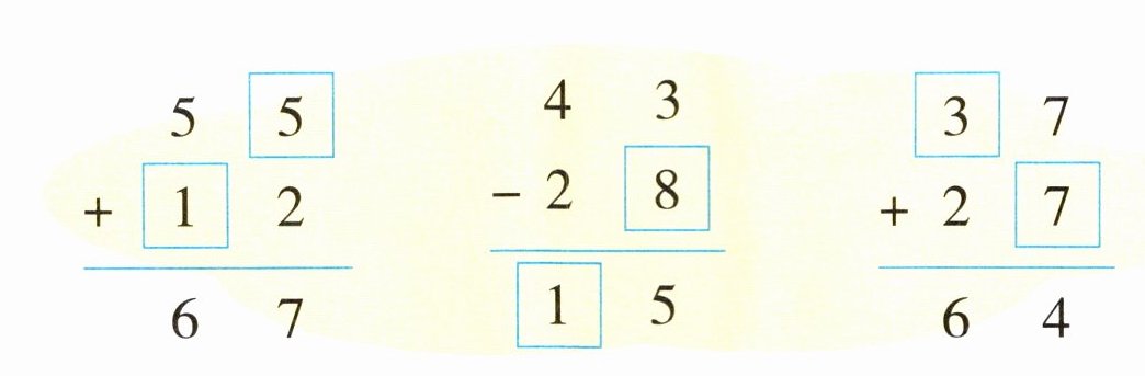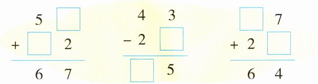 第一个竖式,个位上,$□ +2= 7$,所以$□ =7-2= 5$;十位上,$5+□ = 6$,所以$□ =6-5= 1$。第二个竖式,个位上,$3-□ = 5$,不够减,可知此竖式为退位减法,要从十位上借1当10,所以$□ =13-5= 8$;十位上的$□ =4-2-1= 1$。第三个竖式,个位上,$7+□ = 4$,不成立,可知此竖式为进位加法,即$7+□ = 14$,所以$□ =14-7= 7$;十位上,$□ +2+1= 6$,所以$□ =6-2-1= 3$。