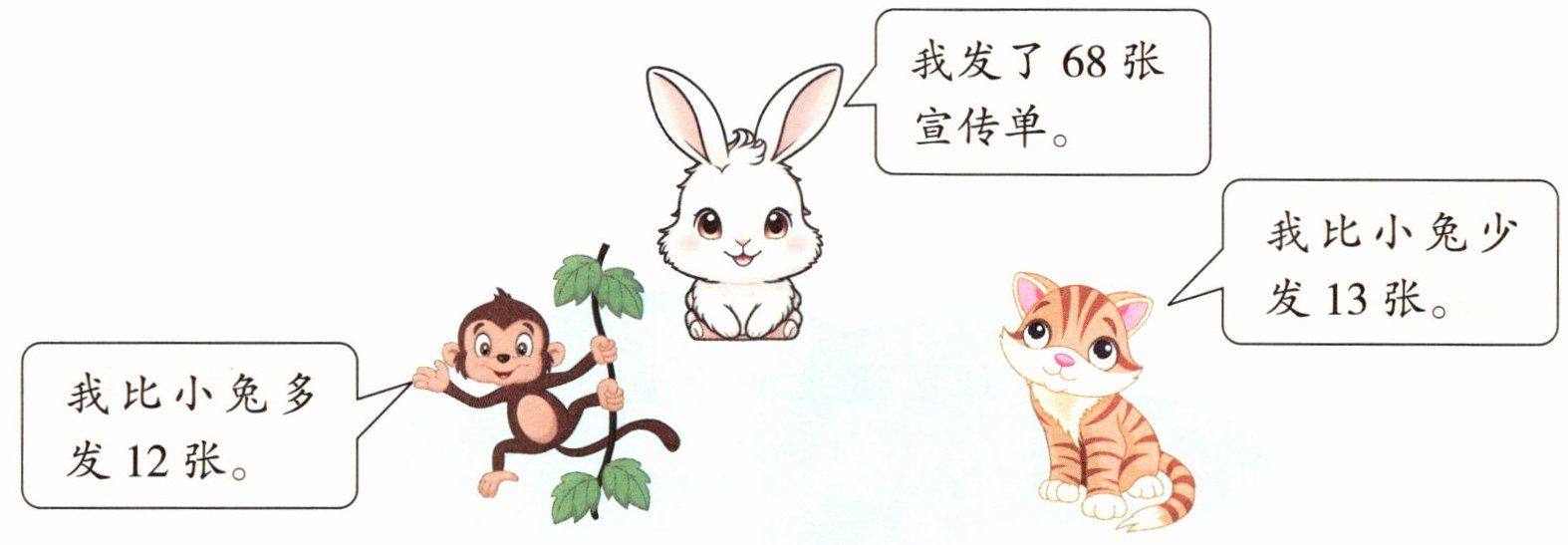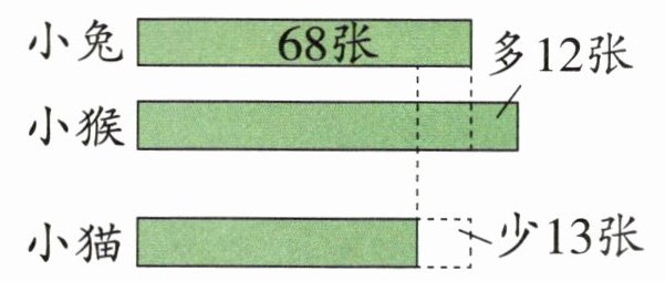 本题属于利用找中间量法解决比多少的实际问题,而在本题中我们通常先求出小猴和小猫各发了多少张宣传单,再解答。根据题意画出如图的示意图,就可以清楚地看出结果。将 小兔 68张 多12张 小猴和小猫发的都与小兔比,因为小猴比小 小猴 小猫 少13张 兔发得多,而小猫又比小兔发得少,所以小猴发得最多,小猫发得最少。它们发的宣传单相差13 + 12 = 25(张)。