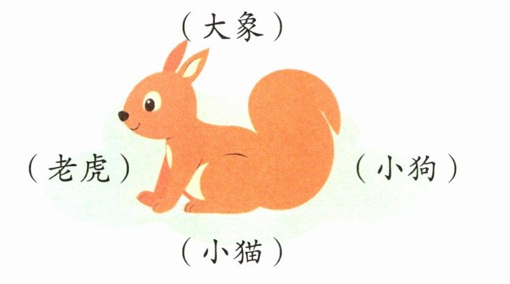 确定小动物们的位置前,先要找准题图中的方向。小松鼠面向西,说明小松鼠身前是西,身后是东,再根据“面西背东,左南右北”判断出小松鼠左面是南,右面是北。小猫坐在小松鼠的南面,即坐在小松鼠的左边;小狗坐在小松鼠的东面,即坐在小松鼠背对的方向;小松鼠坐在大象的南面,也就是大象坐在小松鼠的北面,即坐在小松鼠的右边;老虎坐在小松鼠的西面,即坐在小松鼠面对的方向。