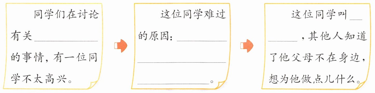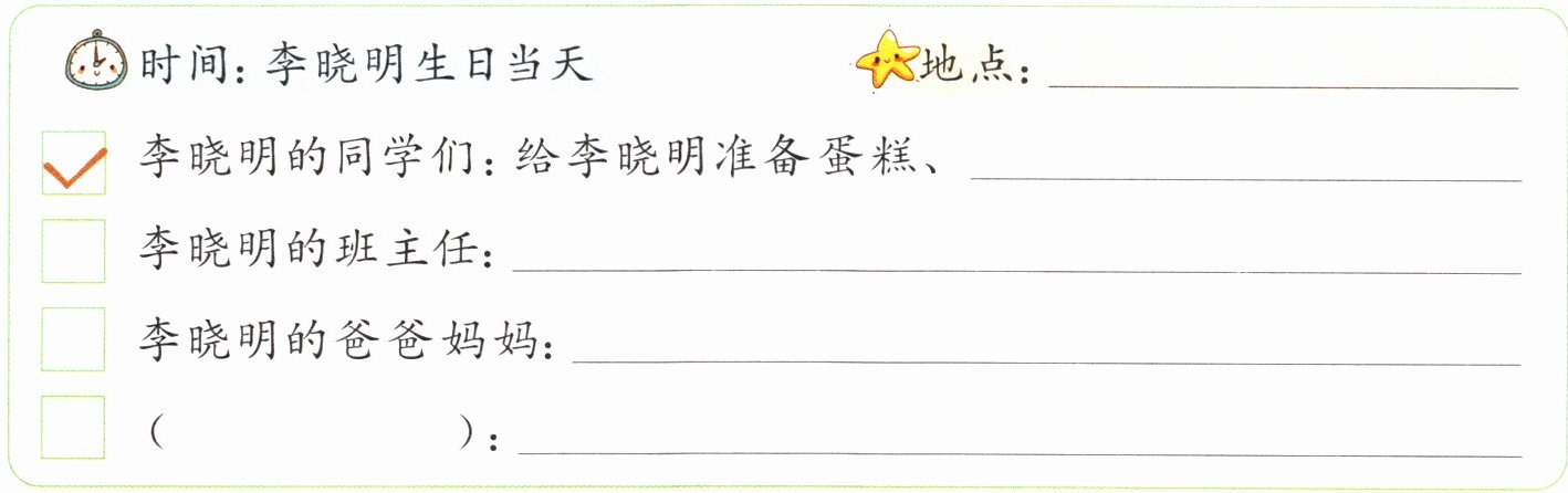 (2)安排地点、人物、事件。先写明地点,补充同学们做的事,再在你想写的人物前打"√"(也可以在括号内填上你想写的人物),写写他们会做什么。