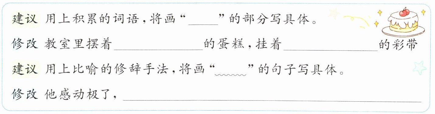 示例:又大又漂亮 闪闪发光 眼眶红红的,眼角泛出珍珠般的泪水。 解析 第一处,要用上恰当的修饰语形容蛋糕和彩带。可以形容蛋糕的气味,如“香喷喷”;还可以形容蛋糕的样子,如“又大又漂亮”。第二处,想象深受感动的李晓明会有什么样的反应,可以写他的语言、动作、神态等,注意用上比喻的修辞手法,表达清晰,想象合理即可。