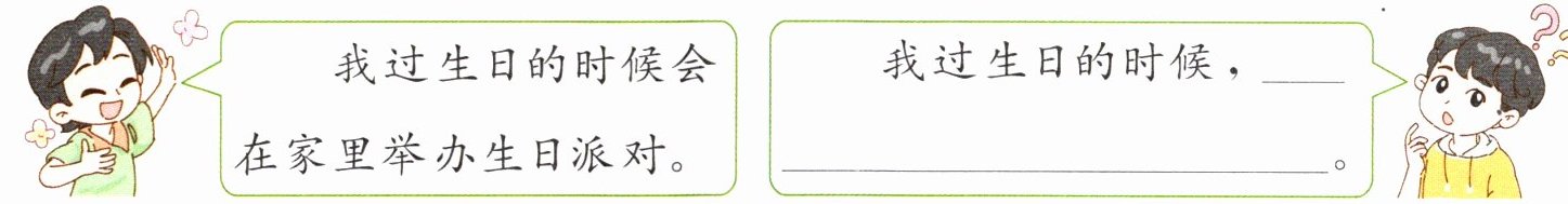 (1)示例:妈妈爸爸会带我去吃一顿大餐 解析 答题时,只要联系生活实际,写出自己是怎样过生日的即可。