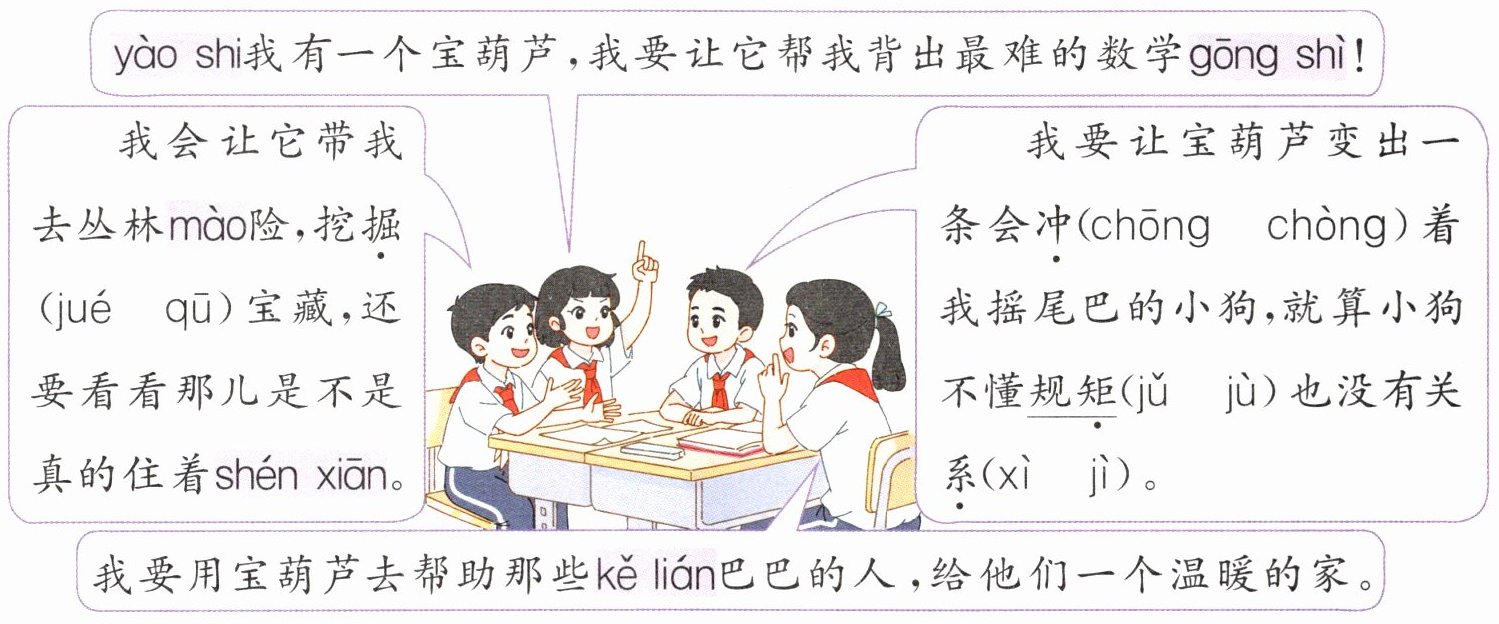 我要用宝葫芦去帮助那些kě lián巴巴的人,给他们一个温暖的家。