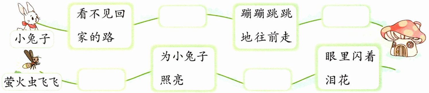 ④小兔子跟着光,小心翼翼地走,生怕自己摔倒。飞飞放慢速度,鼓励小兔子说:“小兔子,别紧张,我离你再近一点儿。有我的帮助,你一定能找到家的!”小兔子心里踏实多了,