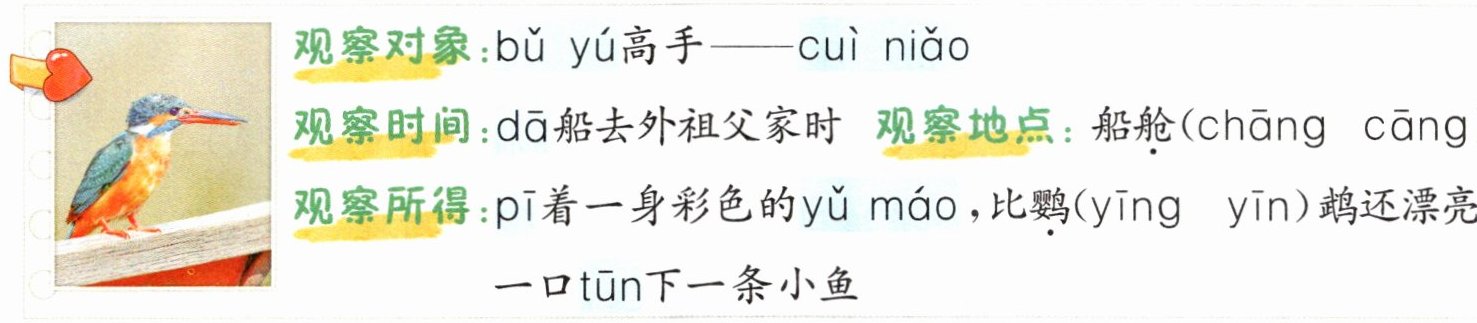 观察所得:pī着一身彩色的yǔ máo,比鹦(yīng yīn)鹉还漂亮;一口tūn下一条小鱼