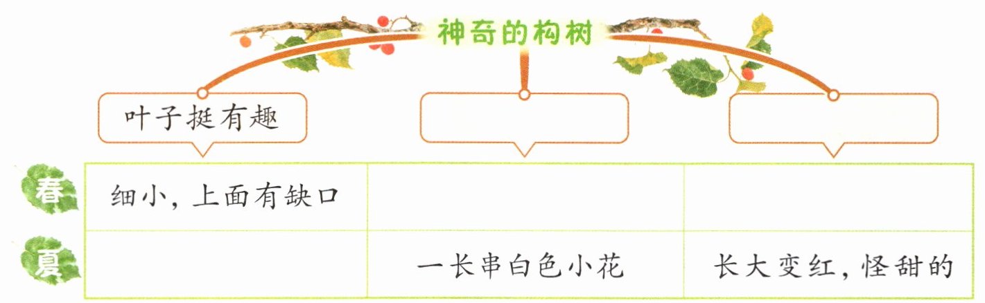 8. 作者通过仔细观察,发现了构树的变化。根据本文内容,完成导图。