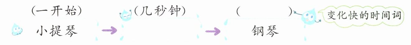 解析 本题考查对文中相关信息的梳理。文中写夏雨一开始像小提琴曲那样轻柔舒缓;接着,只几秒钟就像强劲有力的战鼓;不一会儿,雨停了,打在雨篷上的雨像钢琴声。根据以上内容填空即可。“一开始”“几秒钟”“不一会儿”可以体现夏雨变化快的特点。