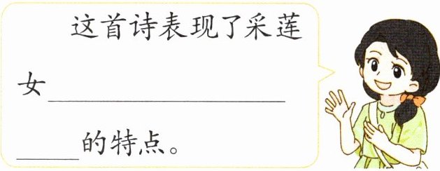 解析 补全古诗时,要在背诵的基础上默写。全诗描写了采莲女在荷塘中若隐若现、人花难辨的生动画面,表现出采莲女天真烂漫、朝气蓬勃的特点。