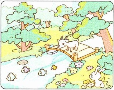 3. 示例:上面有一座弯弯的小桥,弯弯的小桥上有一只正在欣赏水中游鱼的小羊。