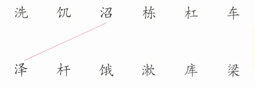 解析 结合文字提示,抓住“组成词语的两个字偏旁相同”的特点即可完成连线。(1)示例:海洋 江河 伙伴 他们 解析 可以根据日常积累写出偏旁是“氵”和“亻”的字,再看看它们能组成什么词。(2)丿 示例:水库 解析 边数笔画边写“饿”字,“饿”的第9笔是撇。“库”能组成“仓库、宝库、金库、库房”等词语。