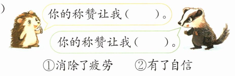 (1)① ② 演一演略 解析 结合课文内容可知,小獾的称赞消除了小刺猬的疲劳,小刺猬的称赞让小獾有了自信。