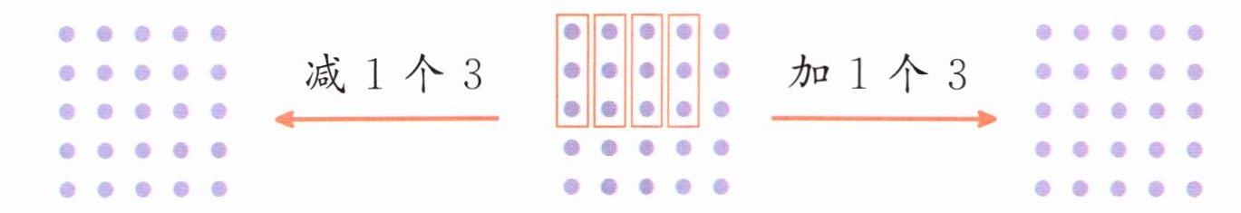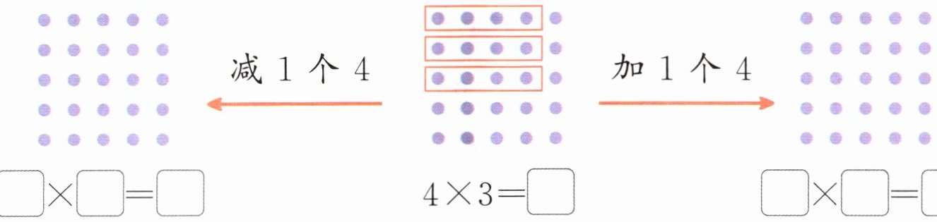 左边的图:减1个4→组数从3变成2→4×2=8。右边的图:加1个4→组数从3变成4→4×4=16。第二组,中间的图圈了4组点子,每组3个,根据“三四十二”得出结果。