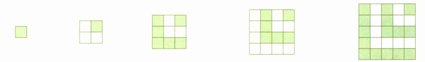 解析 由题可知,加法算式表示每幅图从右上方开始,绿色小正方形与白色小正方形的数量依次相加;乘法算式表示每行(列)小正方形的个数乘行(列)数,据此填一填。发现:几个从1开始的连续单数相加的和,与几乘几的积相等。